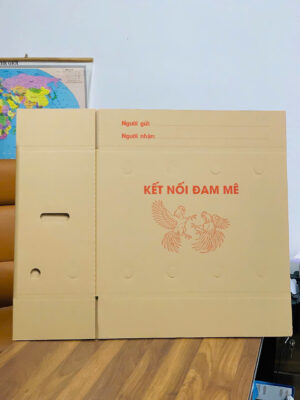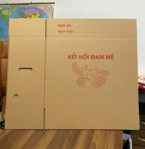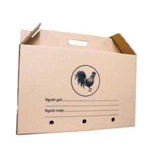 Thùng carton đựng gà sống được làm từ giấy carton cứng, nhiều lớp, có khả năng chịu lực và giữ form tốt trong quá trình vận chuyển. Thùng được thiết kế đục lỗ thông khí xung quanh để đảm bảo lưu thông không khí, giúp gà không bị ngạt. Kết cấu thùng chắc chắn, nắp gập kín, hạn chế gà thoát ra ngoài khi di chuyển.