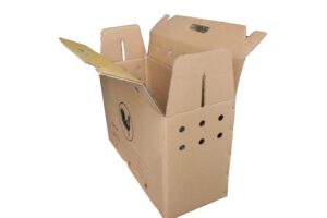 Thùng carton đựng gà sống được làm từ giấy carton cứng, nhiều lớp, có khả năng chịu lực và giữ form tốt trong quá trình vận chuyển. Thùng được thiết kế đục lỗ thông khí xung quanh để đảm bảo lưu thông không khí, giúp gà không bị ngạt. Kết cấu thùng chắc chắn, nắp gập kín, hạn chế gà thoát ra ngoài khi di chuyển.